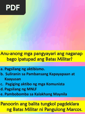 1Ano-ano ang pangyayari naganap bago ideklara ang batas militar. Suliranin sa Pambansang Kapayapaan at Kaayusan c. Maiisa-isa ang mga pangyayari na nagbigay daa sa pagtatakda ng batas malitar at Natalakay ang kahulugan ng batas militar.