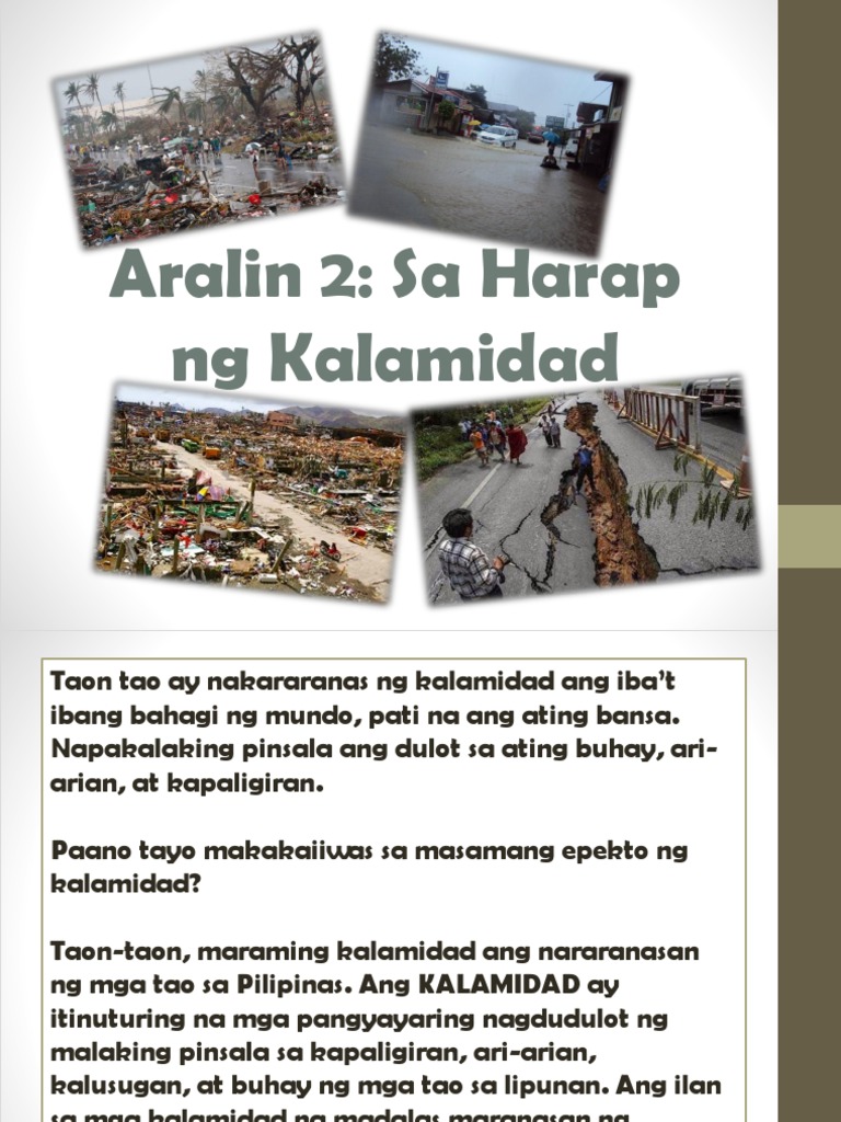 Ilagay sa madaling madafampot ang mga emergency kit upang mas madali itong madadampot kung. Ang gobyerno at iba pang nagkakawanggawa ay nakapokus sa pagtulong sa mga tao para makaraos at hindi para palitan ang lahat ng nawala sa mga biktima. Sa araling ito malalaman natin ang ibat-ibang kalamidad at sakuna na dapat paghandaan.